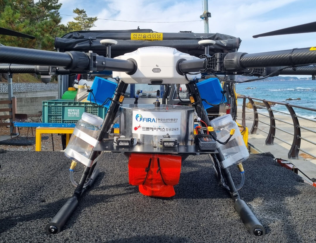 A special purpose drone developed through technical cooperation with the Korea Fisheries Resources Corporation. A drone that moves and discharges cheepae with low survival rates to the correct point favorable to habitat after discharge